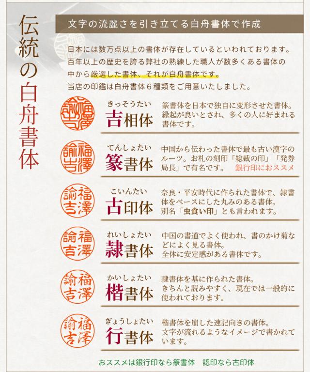 そんな白舟書体を6種類ご用意。吉相体(きっそうたい)、篆書体(てんしょたい)、隷書体(れいしょたい)、古印体(こいんたい)、楷書体(かいしょたい)、行書体(ぎょうしょたい)