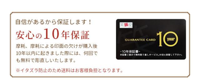 当店で購入された印鑑で「摩耗」「摩耗による印面の欠け」が購入後10年以内に起きました際には、何回でも無料で彫り直し致します。