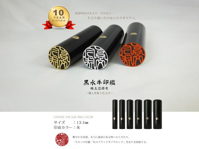 印鑑 はんこ 銀行印 黒水牛 ケース無し 印面朱色 実印 認印 個人印 ハンコ 仕事 職場 13.5mm 10年保証