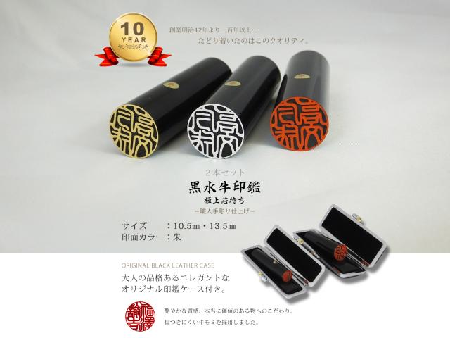 印鑑 はんこ 銀行印 黒水牛 2本セット ケースあり 印面朱色 実印 認印 個人印 ハンコ 仕事 職場 10.5mm 13.5mm 10年保証