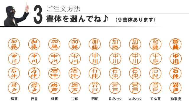 明朝体(みんちょうたい)、角ゴシック(かくごしっく)、丸ゴシック(まるごしっく)、楷書体(かいしょたい)、行書体(ぎょうしょたい)、隷書体(れいしょたい)、古印体(こいんたい)、篆書体(てんしょたい)、勘亭流(かんていりゅう)。日本の伝統的な美しい文字の流麗さをさらに引き立ててくれる書体でひとつひとつ丁寧に文字を作成させていただきます。
