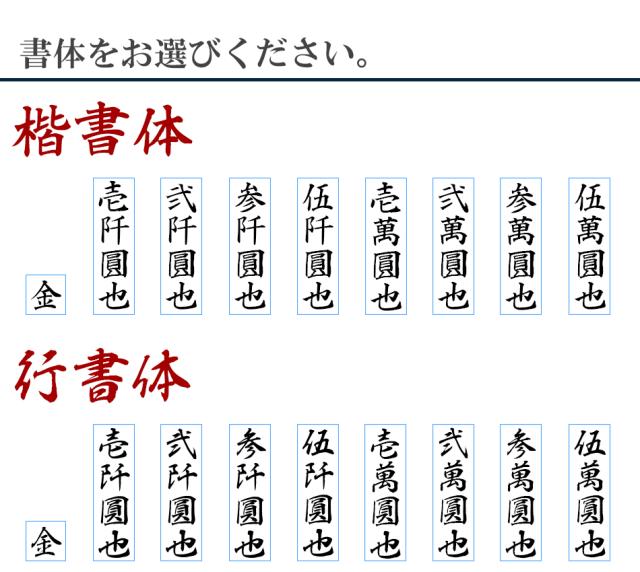楷書体(かいしょたい)、行書体(ぎょうしょたい)。