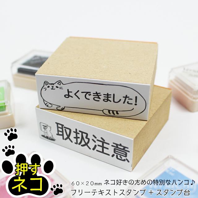押すネコ ゴム印 フリーテキスト スタンプ台セット 名前 メッセージ 封筒 はがき 60mm×20mm
