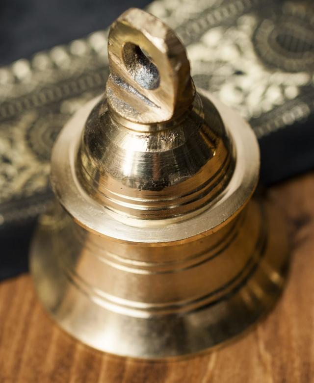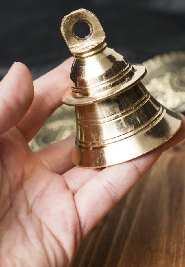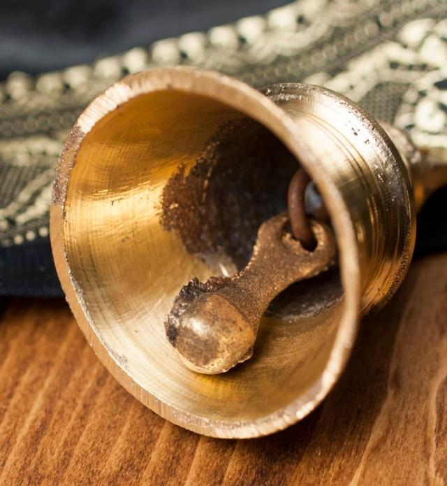 こちらは、インドの聖地バラナシで祭礼用として使用されているハンドベルです。真鍮を型に入れて削りだした、素朴な風合いがインドらしい一品です。音色は澄んでいて涼やかな感じです。