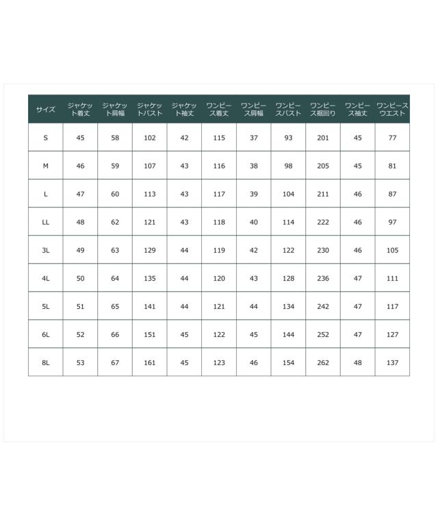 品質=<ジャケット>[表地]ポリエステル97%・ポリウレタン3%[裏地]ポリエステル100% <ワンピース>[表地]綿100%[裏地]ポリエステル100%【裏地】ジャケット:有(総裏)、ワンピース:有(身頃部)ジャケット:前ホック開ワンピース:後ファスナー開この商品は2点同サイズのみで販売します。レース柄の出方が多少異なる場合があります。 繊細なレースを使用しているため、引っかかりなどにご注意ください。※注意コメントデザインによりサイズ感が異なりますので、詳しい仕立てサイズ表をご確認ください。お客様のパソ