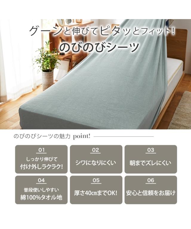 綿100%素材のタオル地のシーツです。汗をよく吸って、さらさらと快適にお使いいただけます。のびのびシーツなので、グ〜ンと伸ばしてピタっとはまる、伸縮性のあるシーツです。タテにもヨコにも伸びるので、付け外しが簡単で、面倒なシーツの取りかえがラクちん!仕上がりも綺麗!
