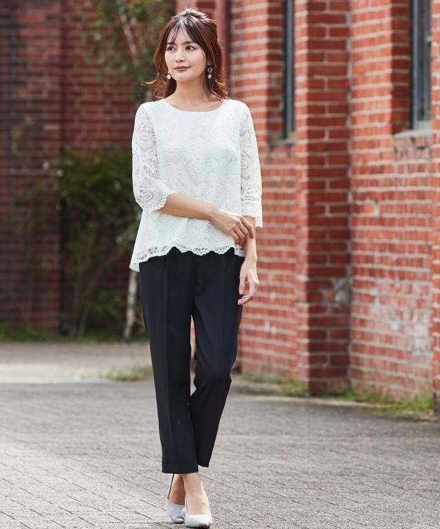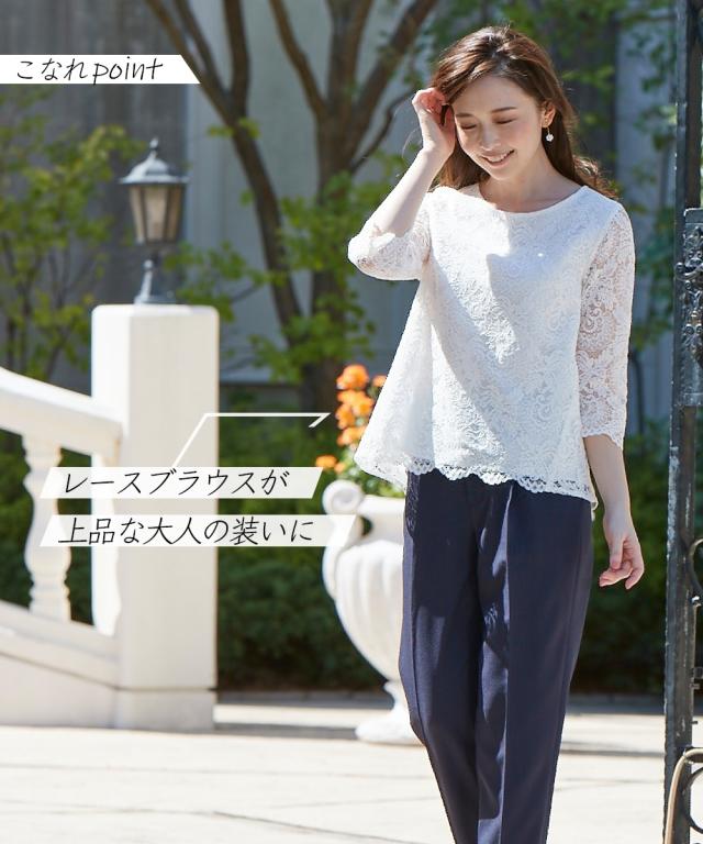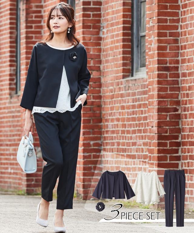 【入園・入学・卒園・卒業】レースブラウステーパードパンツスーツ3点セット(コサージュ付)<大きいサイズ有>