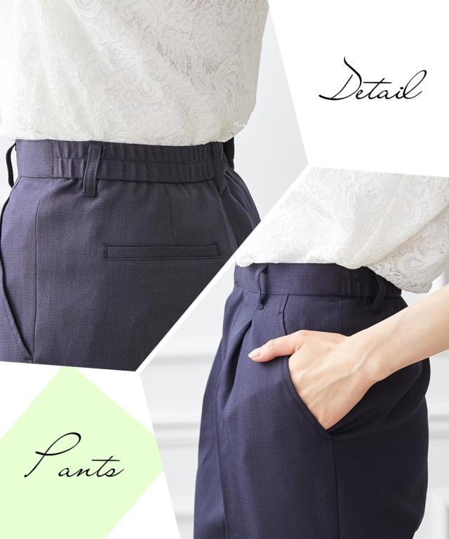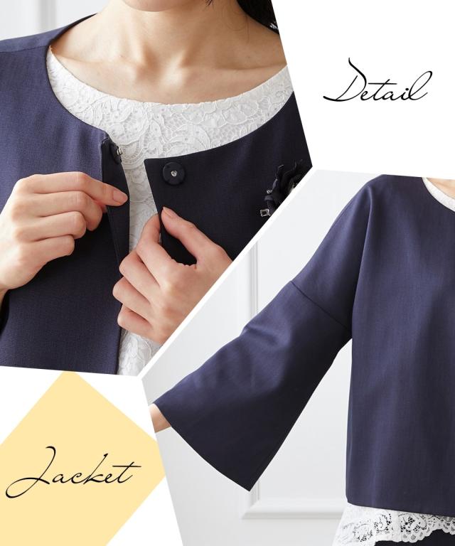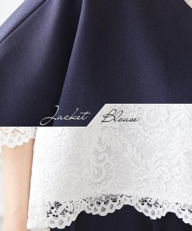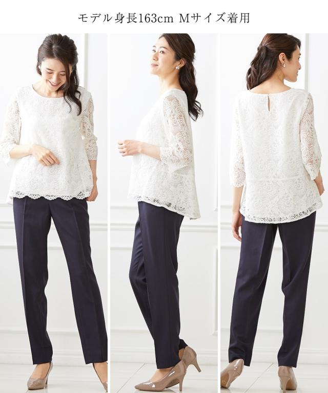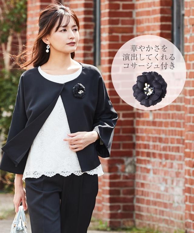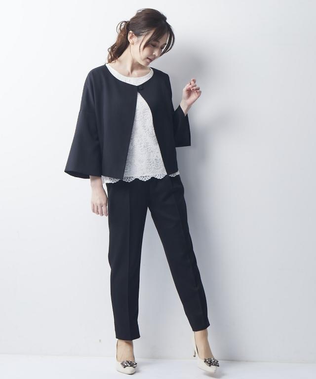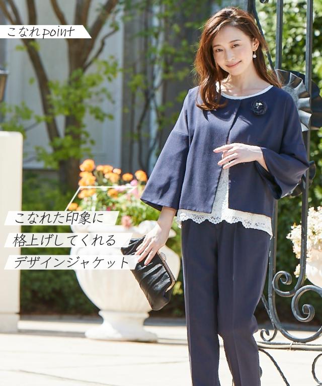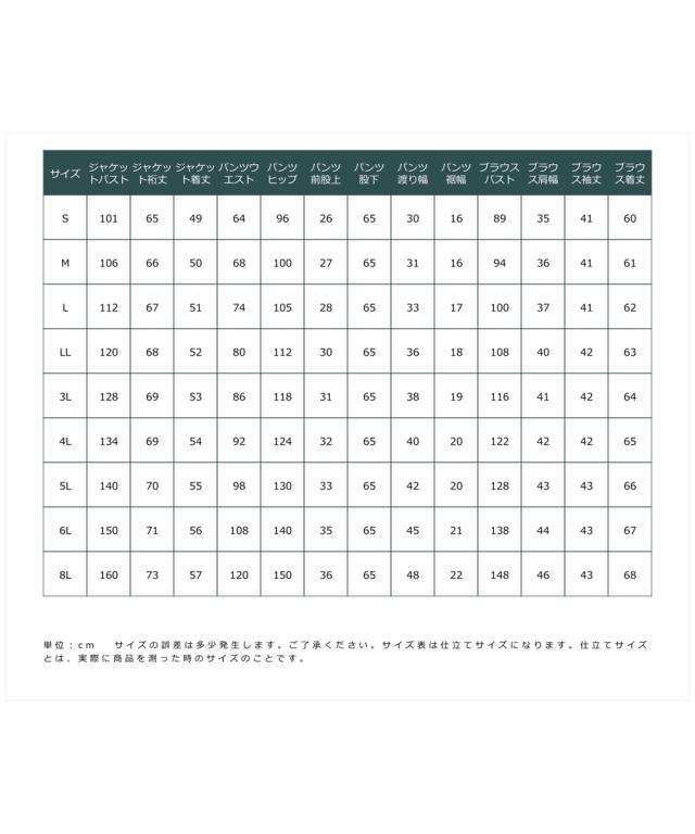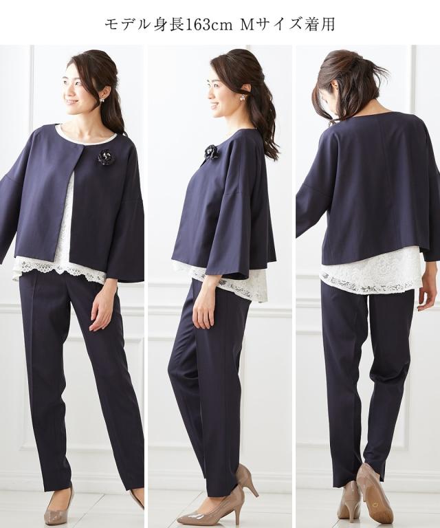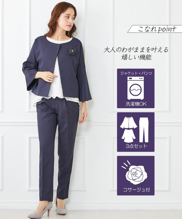 品質=<ジャケット>[表地]ポリエステル100% [裏地]ポリエステル100% <パンツ>ポリエステル100% <ブラウス>[表側]綿35%・ナイロン35%・レーヨン30% [裏側]ポリエステル100%【裏地】ジャケット:有(総裏)、パンツ:無、ブラウス:有(身頃) ジャケット:肩パッド無 前スナップ ブラウス:後ろ涙開き パンツ:前ファスナー内ボタン開 ウエスト後ゴム入 ポケット両脇・後飾り コサージュは取り外しできます。 この商品は3点同サイズのみで販売します。 レース柄の出方が多少異なる場合がありま