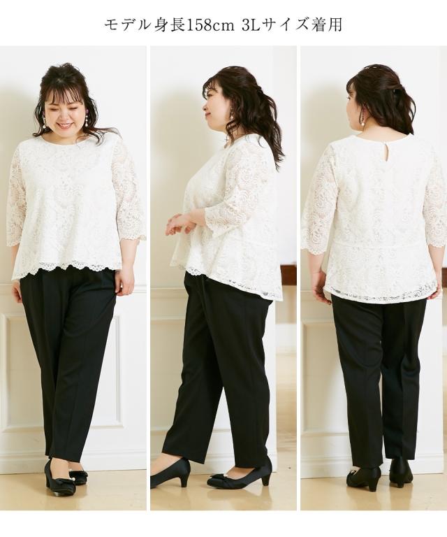 スーツ パンツ フォーマル 大きいサイズ レディース 入園 入学 卒園 卒業 レース ブラウス テーパード 3点セット コサージュ付 ネイビー系/黒系 4L/5L/6L セレモニースーツ 母 ママ 卒業式 入学式 セットアップ ニッセン nissen