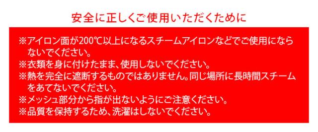 | アイロン面が200℃以上になるスチームアイロンなどでご使用にならないでください。 衣類を身に付けたまま、使用しないでください。 熱を完全に遮断するものではありません。同じ場所に長時間スチームをあてないでください。 メッシュ部分から指が出ないようにご注意ください。 品質を保持するため、洗濯はしないでください。 汚れた場合は、固く絞ったきれいな布で軽く拭いてください。 ご使用後は本品をよく乾かしてください。 |
