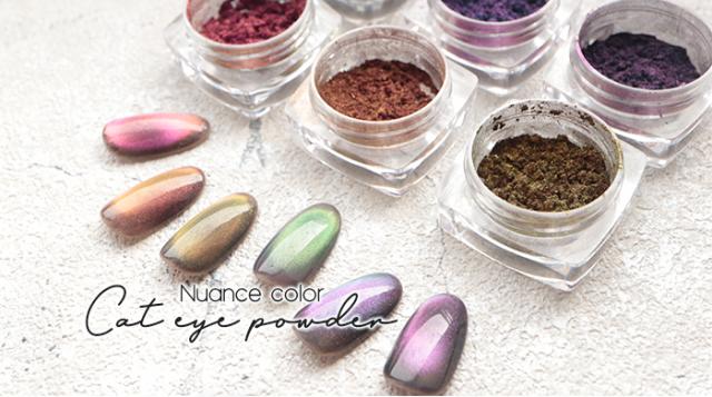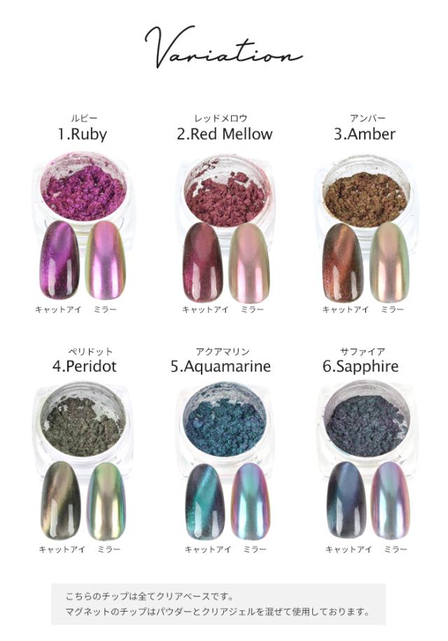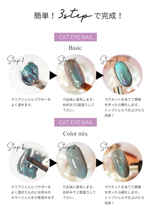 | 商品説明 | 人気のキャットパウダーがカラーになって新入荷! キャットパウダーをクリアジェルに混ぜて硬化する前に磁石で光を引き寄せお好みのデザインに! ベースカラー次第で見え方いろいろ♪ 使い方次第でキャッツアイもミラーもグリッターとしても使える超万能! アートの幅が広がる新感覚パウダー☆ |