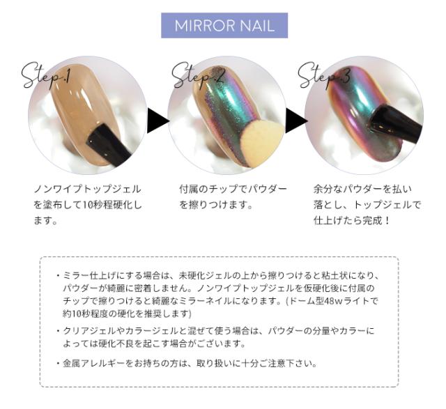 | 注意事項 | ミラーパウダーのように擦りつける場合は、ノンワイプトップジェルを仮硬化(48wで約10秒)後 未硬化ジェルの上から擦りつけると粘土状になり綺麗に擦り付きませんので ご注意ください。 微粒子のパウダーになりますので、取り扱いには十分ご注意下さい。 キャットアイパウダー専用マグネットは付属しておりませんのでご注意ください 分量やミキシングカラーによっては、硬化不良を起こす場合がございます。 |