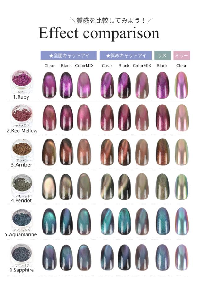 - キャッツアイネイル初挑戦したく、ルビーと迷ったのですがアクアマリン購入しました。 うきうきでブラックのジェルと混ぜて、一緒に購入したスティックタイプのマグネットで全面キャッツアイを試みたのですが… どんなに濃度変えてみても緑です。 黄緑とかモスグリーンとかでもなく、とてもパキッとした鮮やかな緑。 角度によってはピンクがかったパープルや、群青ぽい色にも光りますが、基本は本当に緑です。 使い勝手も難しくなく仕上がり等も満足なのですが、あまりにも画像と違い過ぎるのが残念です。 ちなみにミラーで使用すると、画像通りの少しピンクがかったブルーでした。 混ぜたブラックのジェルもこちらで以前購入した物だったのですが、相性等あるのでしょうか。 次はルビーを購入するつもりなのですが、こちらは可愛いピンク色だと嬉しいです。