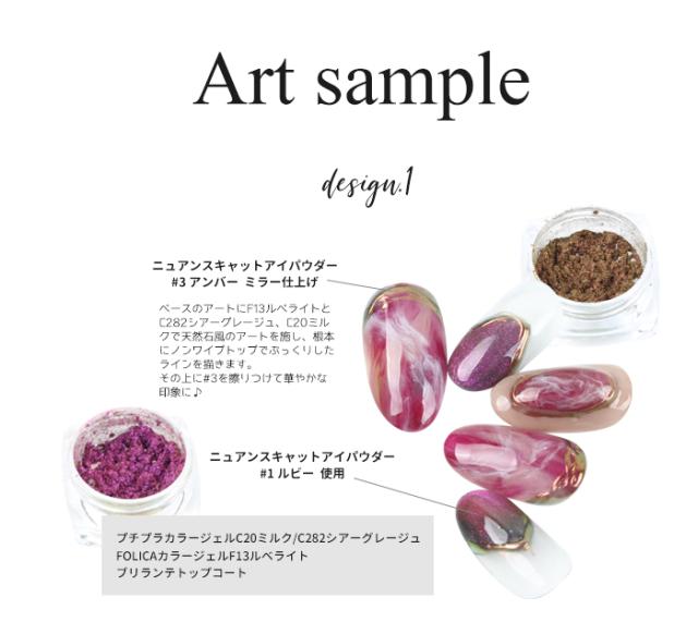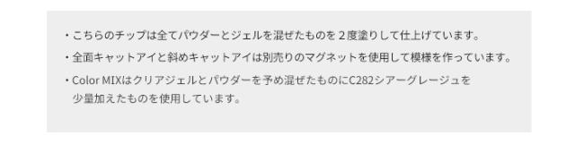 | 作例チップ使用アイテム | 【作例1】ニュアンスキャットアイパウダー【1】ルビー・【3】アンバー使用 プチプラカラージェル【C20】ミルク プチプラカラージェルシアーカラーシリーズ【C282】シアーグレージュ Folica(フォリカ)カラージェル【F13】ルべライト 【作例2】ニュアンスキャットアイパウダー【2】レッドメロウ使用 チアジェルカラージェル【E52】マロングラッセ/【E55】ジェットブラック/【E99】クリアホワイト フレークナゲット【1】ゴールド/オーロラシェルストーン【1】ホワイト ナチュラルシェルストーン12色 【作例3】ニュアンスキャットアイパウダー【4】ペリドット使用 プチプラカラージェル【C56】チャコール/【C159】モスグリーン プチプラカラージェルシアーカラーシリーズ【C281】ハンサムグレー/【C282】シアーグレージュ 3Dパーツ形成ジェル【9】ブラック/GRACIELノンワイプマットジェル クリア |