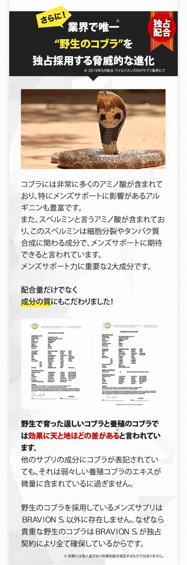 【野生のコブラを独占配合】野生で育ったコブラと養殖のコブラでは効果に天と地ほどの差があると言われています。また野生のコブラを採用しているメンズサプリは他にありません。なぜなら私達が独占契約により全て確保しているからです。