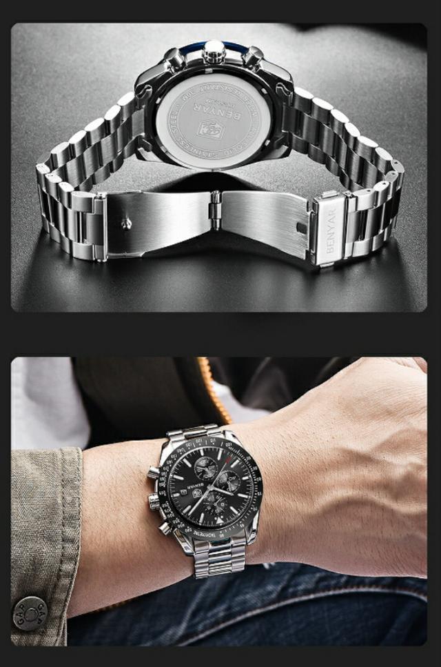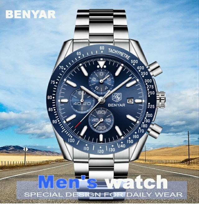 BENYAR 送料無料 税込み 最新 クロノ ウォッチ BY4901 黒 BY4903 青 クォーツ ブラック ブルー ストップウォッチ カレンダー 色 カラー アナログ タイプ 腕時計 かっこいい クール お洒落 メンズ 重厚 高級 クール 流行 人気