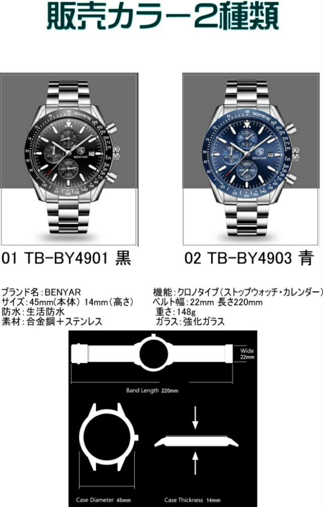 BENYAR クロノ ウォッチ BY4901 黒 /BY4903 青