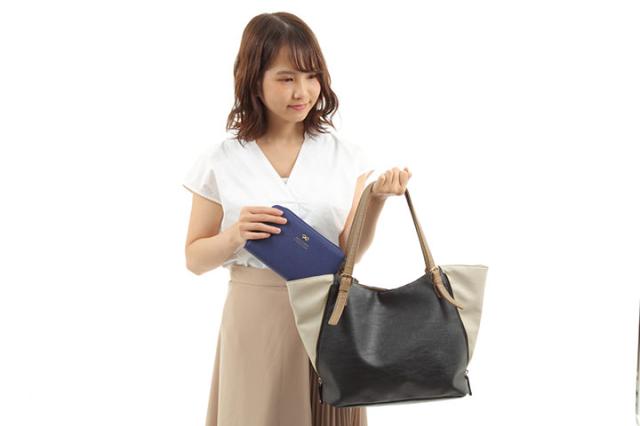 ガバっと開くマチで、通帳、スマホなど色々収納できます。