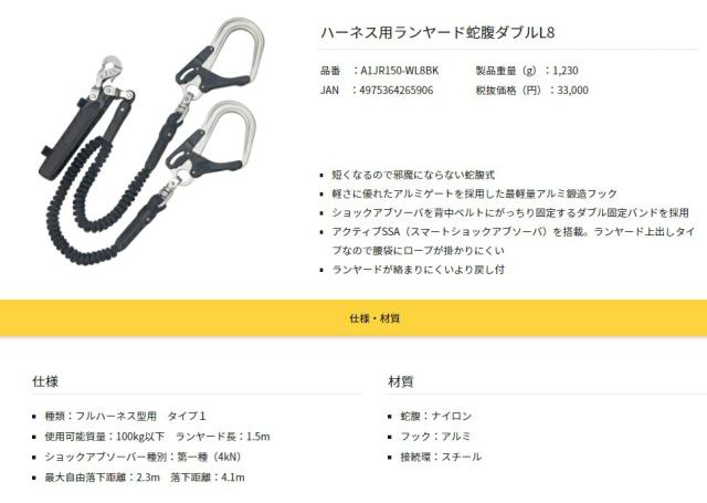新規格 タジマ ハーネス用ランヤード 蛇腹 ダブルL8 A1JR150-WL8BK ブラック ダブルL8ランヤード より戻し付 使用可能質量100kg以下 TJMデザイン TAJIMA 265906 ’