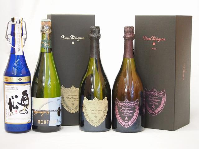 最高峰SAKE日仏西4本セット(フランスドンペリニヨン白 ドンペリ二ヨンロゼ ギフト箱付750ml×2本 スペインモンサラ セミ セコスパークリング やや甘口 750ml×1本 日本福島県奥の松 純米大吟醸プレミアムスパークリング720ml×1本)
