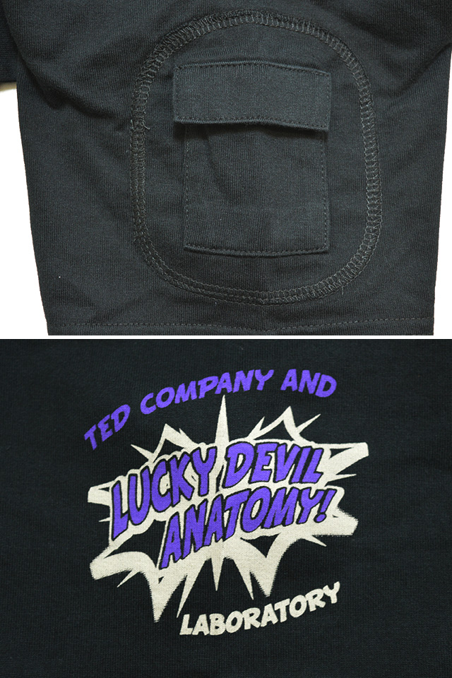 テッドマンから「スケルトンテディー半袖Tシャツ(TDSS-525)」のご紹介です! とある研究所でテッドマンが考究されたというストーリーを元に、その当時の資料をデザインし落とし込んだグラフィックTシャツです。 背中には、スケルトンになったテッドマンが描かれており、随所にテッドマンを調べ上げた結果が表記されています。 バックにしっかり柄を入れている分、フロントはシンプルに仕上げ、メリハリを付けました。 生地はストレッチのきいた、さらりとしたものを使用。 | ||||||||||||||||||||||||||||||