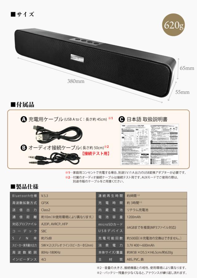セット内容:本体・充電用USBケーブル(長さ約45cm)・オーディオ接続ケーブル(長さ約50cm)・日本語説明書