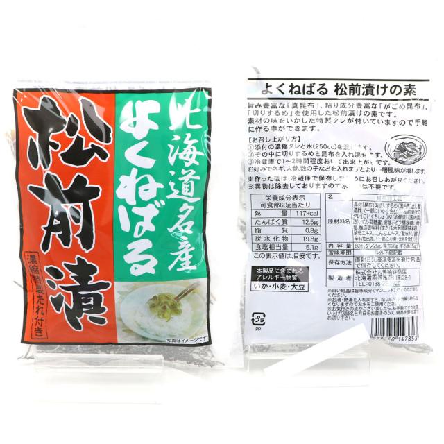 ・内容量:一袋当たりの内容量:60g(松前漬けのタレ25g、昆布20g、するめ15g)