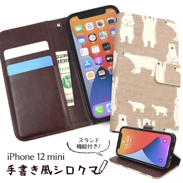 スマートフォンケース iPhone12mini用 手帳型 シロクマ スマホケース 手書き風 しろくま 携帯ケース 装着簡単 ベーシック スマホケース 横開き オシャレ お洒落 SoftBank au docomo 大人可愛い 大人女子 ガーリーカジュアル おしゃれ ベーシック
