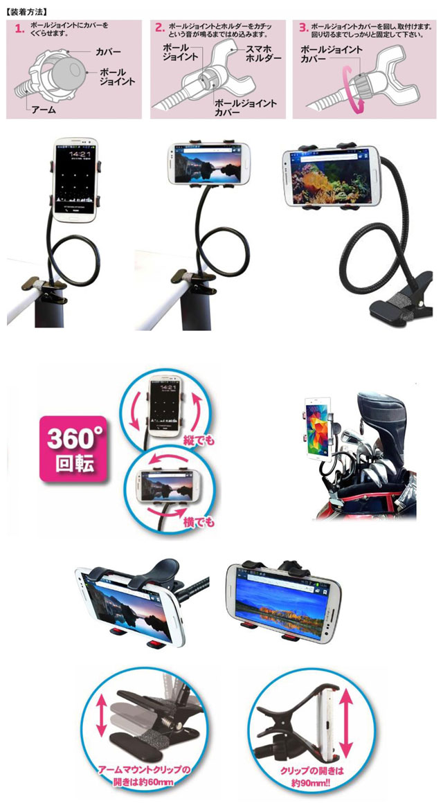 ホルダー部分はクリップ式で、スマホ以外の様々なものを挟むことも可能。