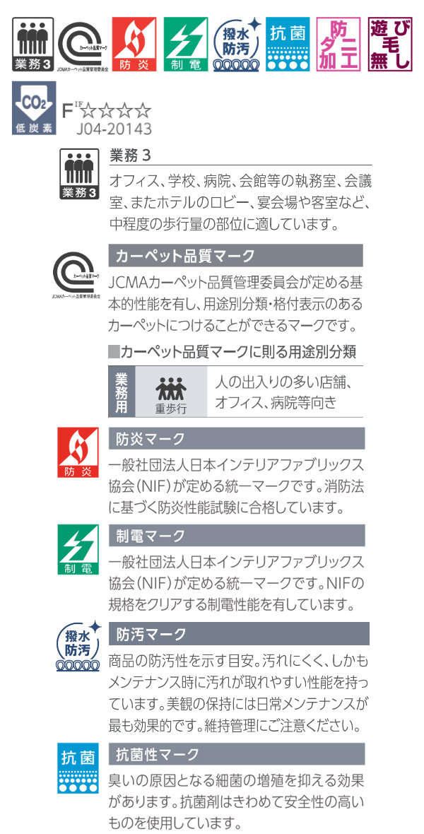 カーペット品質:業務用途・超重歩行・ラグジュアリークラス(歩行快適度)1(認定番号:04-0123)