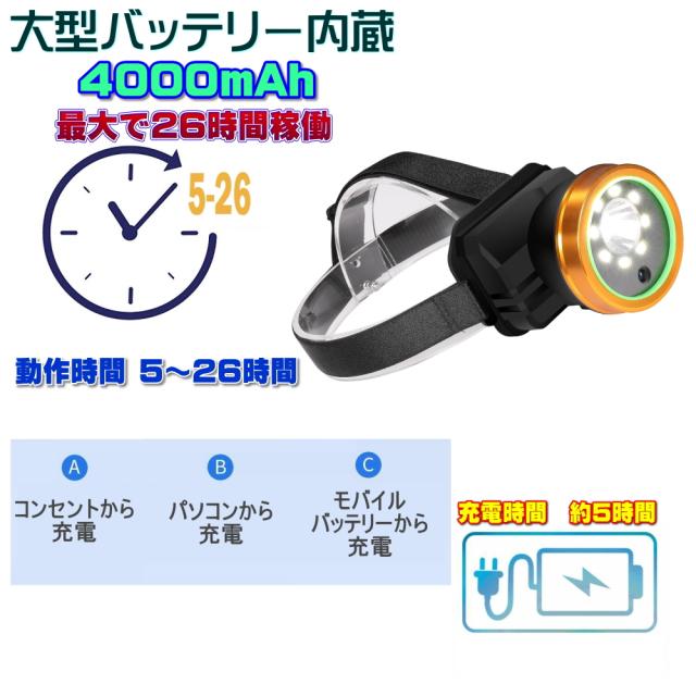 大型バッテリー内蔵(4000mAh)内蔵なので5時間〜最大26時間稼働!