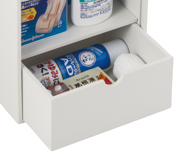 引き出しには、指をひっかけやすい仕様になっているので取り出しやすいです。常備薬や包帯などを入れられます。