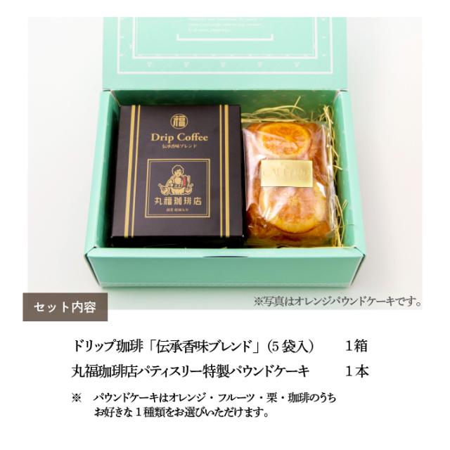 帰省土産 手土産 寒中見舞い バレンタイン チョコ以外 ギフト 伝承香味ブレンド ドリップバッグと 選べる専属パティシエのパウンドケーキ(オレンジ・フルーツ・珈琲・栗) 詰め合わせ スイーツ 常温保存 お取り寄せ 公式 丸福珈琲店
