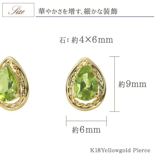 | 地金・素材 | ・ペリドット ペアシェイプカット(品質保証書付き) ・地金:K18YG(18金イエローゴールド) ・ダブルロック キャッチ ※刻印等は異なる場合がございます。 |