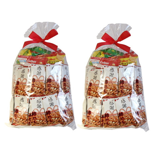 カルビーの小袋スナックや感謝の文字が入ったお菓子のラッピングセットです。2セットでの販売です。かわいくラッピングしていますので、ちょっとした感謝の気持ちを伝えるのにも最適なお菓子です。プレゼントや景品にピッタリ!