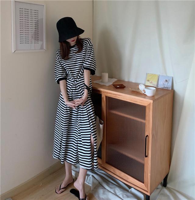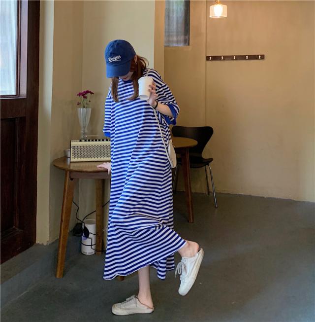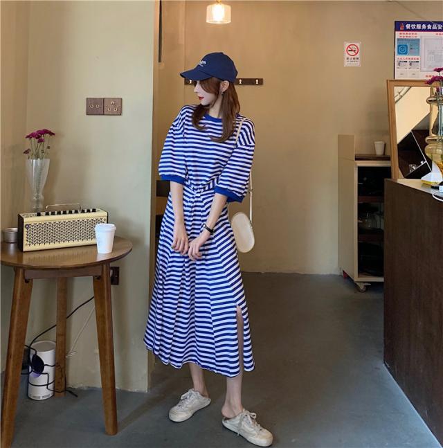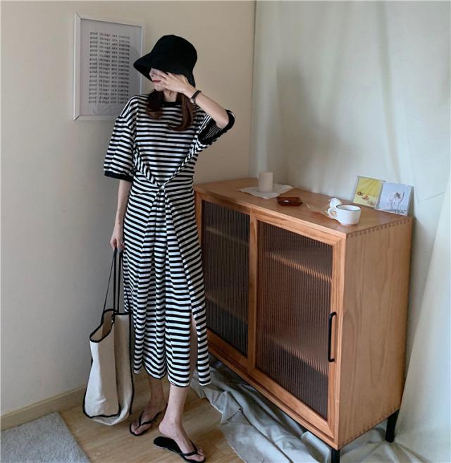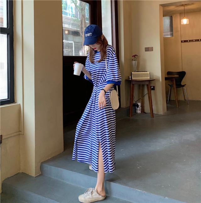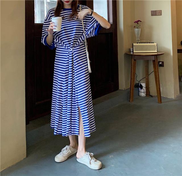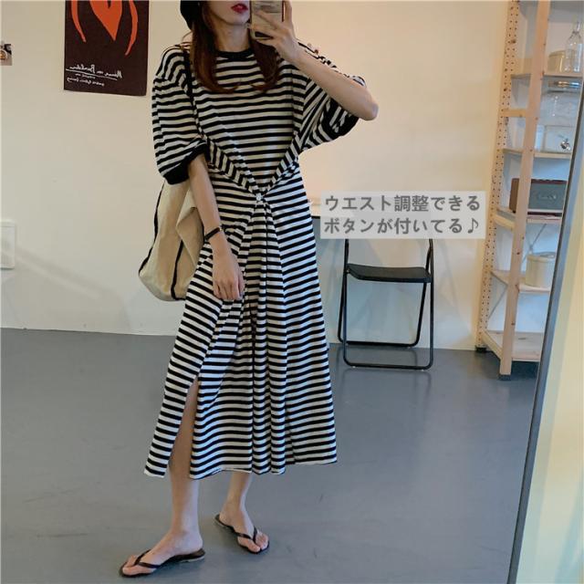 送料無料 Tシャツワンピ ワンピース 長袖 ロング スリット ボーダー カジュアル 大人 ゆったり ゆるワンピース 体型カバー