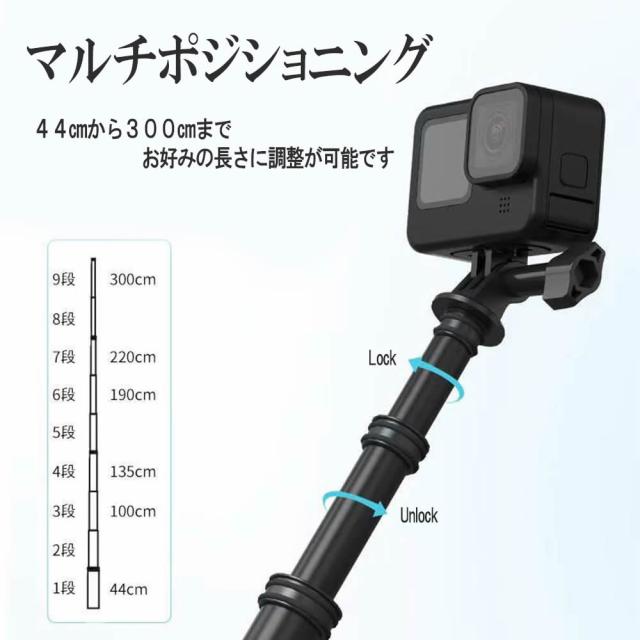9段階調整可 自撮り棒 セルカ棒 Gopro9 8 7 6 5 4用 延長ポール3M 炭素繊維カーボン製 自撮り棒 高所撮影 軽量 伸縮 180°回転 折りたたみ式 Gopro Hero/xiaomi Yi/SJCAMなどのアクションカメラ対応