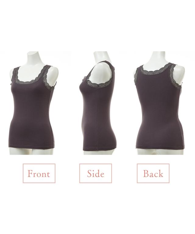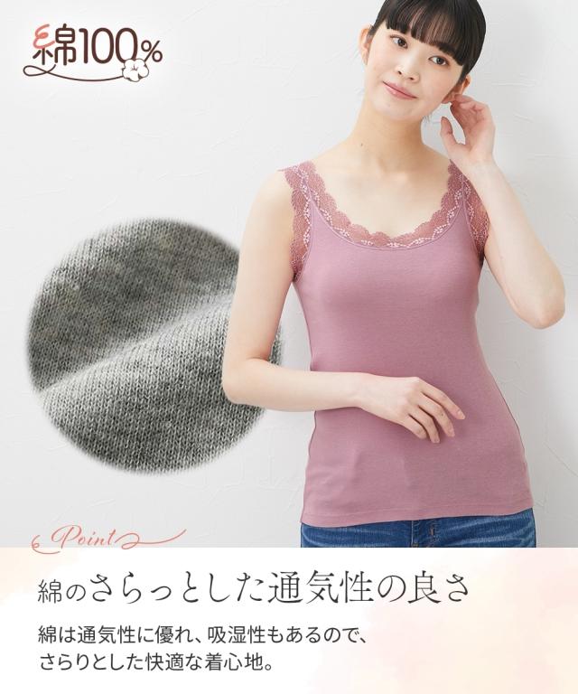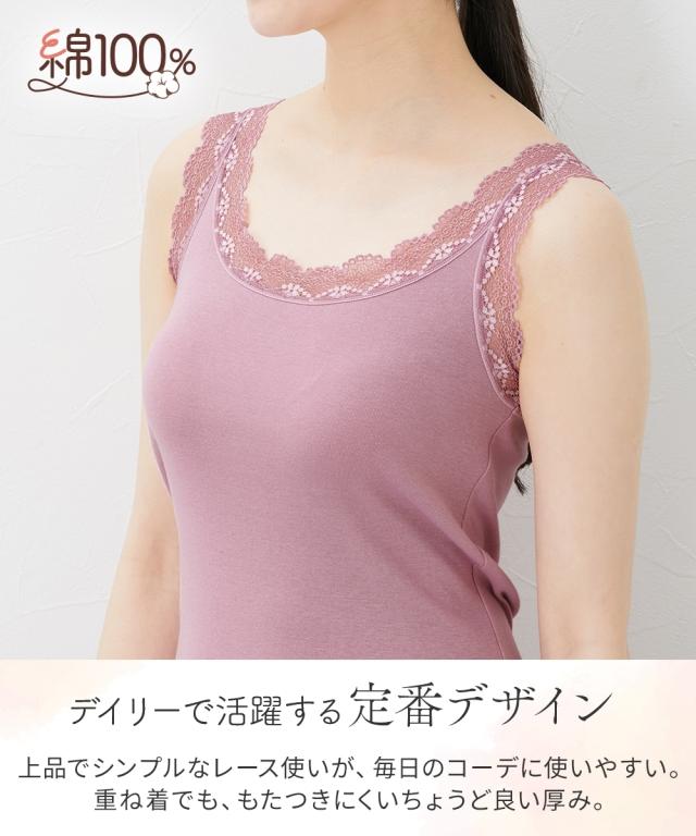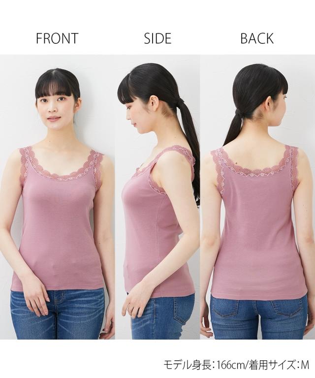 上品なレースタンクにニュアンスのあるスモーキーカラーが登場!アウターカラーに合わせたコーデ自在でデイリーに活躍する4枚組。身頃は綿100%で肌ざわりも快適。