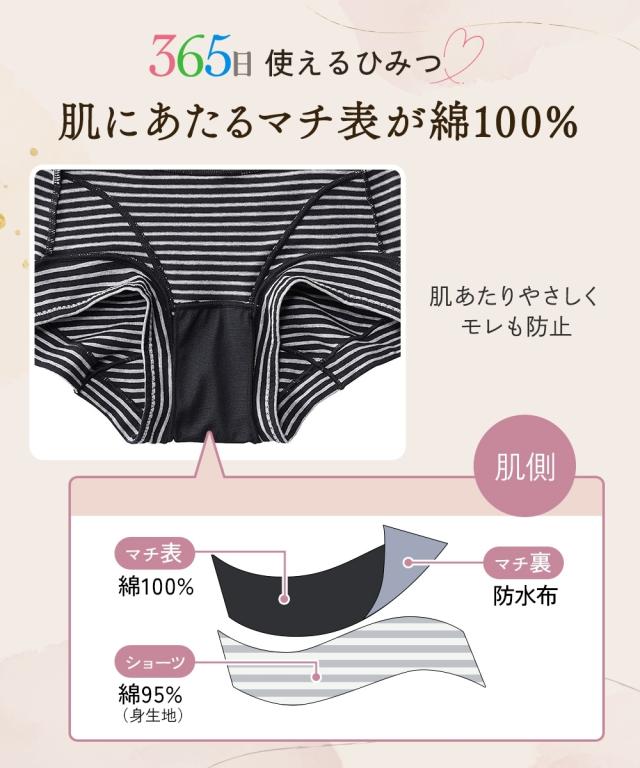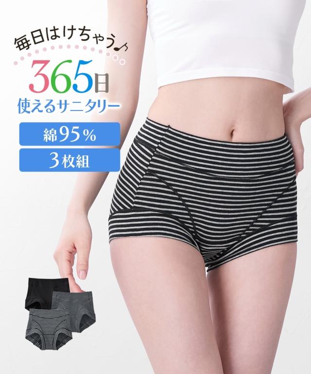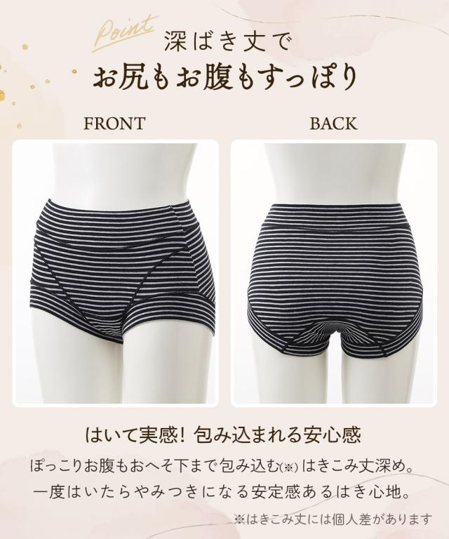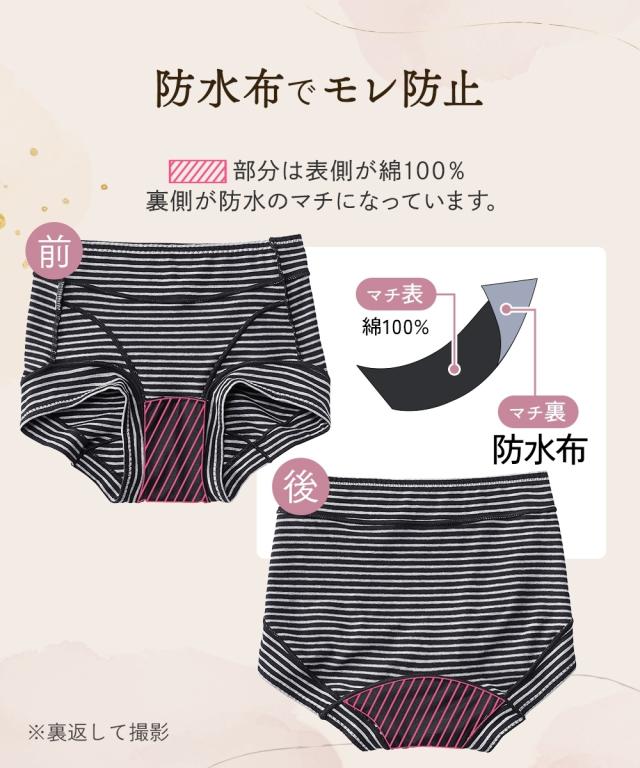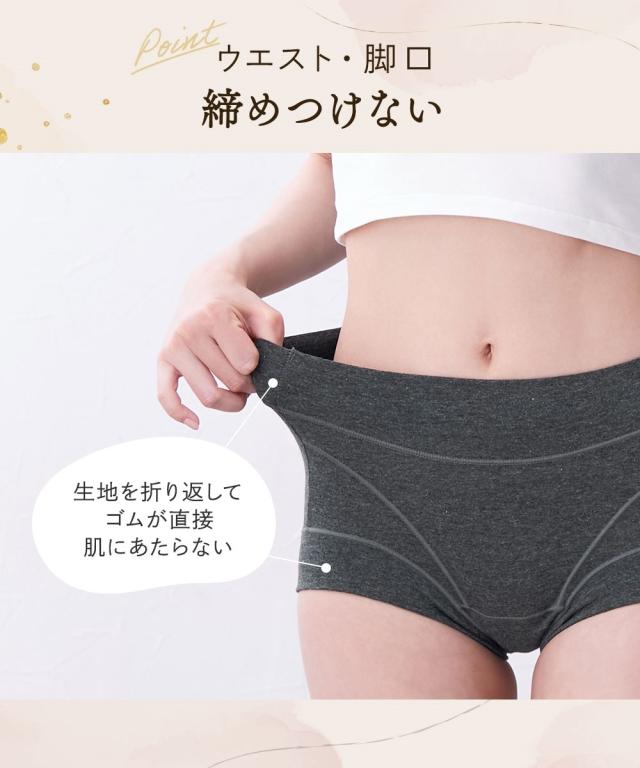 [keyword] 下着 ランジェリー インナー 大きいサイズ レディース 標準サイズ 普通サイズ ゆったりサイズ プラスサイズ おなかスッポリ ハイウェスト 羽付きナプキン対応 サニタリー 昼用 レースなし おしゃれ 脚口らくちん お腹らくちん ストレッチ 伸び 綿混 素材 お買い得セット まとめ買い セット お得 [comment] ■365日使えるショーツ肌側は綿100%、裏側を防水布に。ブルーデイはナプキンを使って、普段はそのまま1枚ばきOK。365日快適に過ごせます。■羽付ナプキンに対応クロッチ裏は生地が二重で、ナプキンの羽を折り込めます。また、生地が離れるので汚れても手洗いしやすい。ウエスト・脚口は折り返し仕様でゴムが肌にあたらず、お腹や脚口へのくいこみや締めつけを軽減したやさしいはき心地。安心の深ばき丈で、綿混ストレッチで快適フィットします。※商品の色移りを防止するために個包装を行っている場合がございます。個包装はプラスティック削減のため一部の色のみに使用しています。