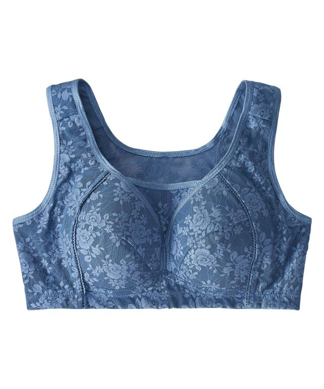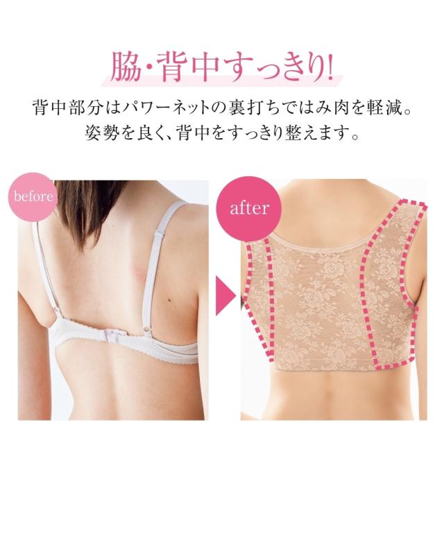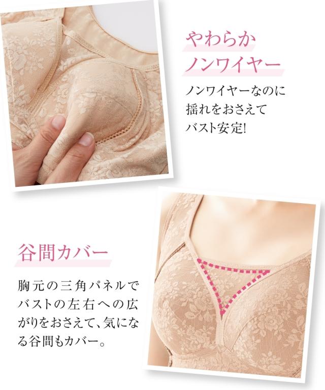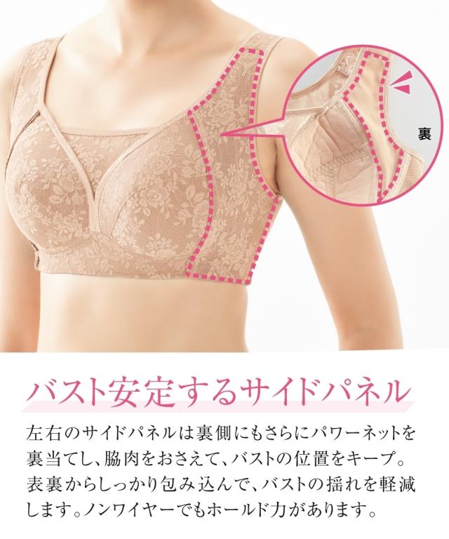 パワーネットを裏打ちしたサイドパネルで脇肉をおさえ、バスト位置をキープ。ノンワイヤーでもホールド力があります。胸元の三角パネルで広がりもおさえて谷間をカバー。3枚はぎのカップが立体的なバストをメイク。
