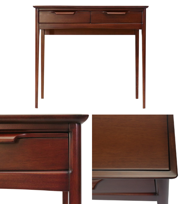 マホガニー材にヴィンテージ感のあるミディアムブラウンのセミマッド塗装を施しています。シンプルなボディーに、手触りの良い取っ手と、すっきりと伸びた細身の脚が特徴です。しっかりと作り込まれた細部とマホガニーの存在感で、高級感のある空間を演出します。