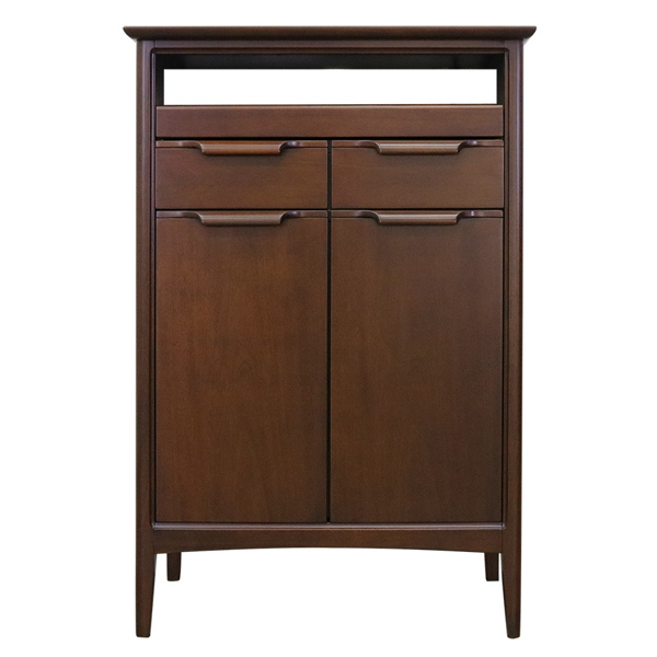 マホガニー材にミディアムブラウンのセミマッド塗装を施しています。無垢材から削り出した手触りの良い取っ手、すっきり伸びた細身の脚が特徴的。アンティークかつシンプルなデザインは、様々なコーディネートにすんなり溶け込みます。