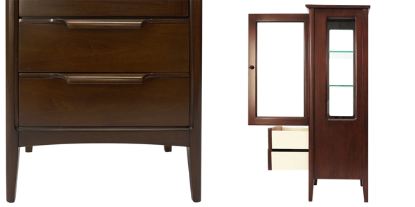 マホガニー材にミディアムブラウンのセミマッド塗装を施しています。手触りの良い取っ手と、すっきりと伸びた細身の脚が特徴です。お気に入りをいつもそばに置いておけるコンパクトなサイズです。
