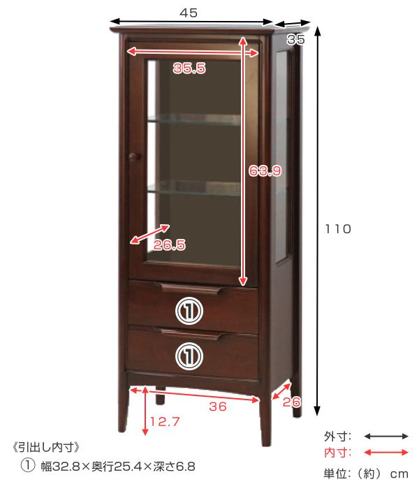 | 材質 | 主材:マホガニー、MDF、突板(マホガニー) 塗装:ポリウレタン塗装 扉・左右側板:ガラス(厚さ3mm) 可動棚:生ガラス(厚さ8mm) |
