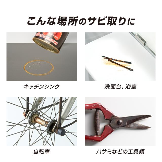 自転車や鎌やハサミ、工具等の頑固なサビに。気になるキッチンシンク、洗面台、浴室のもらいサビに。