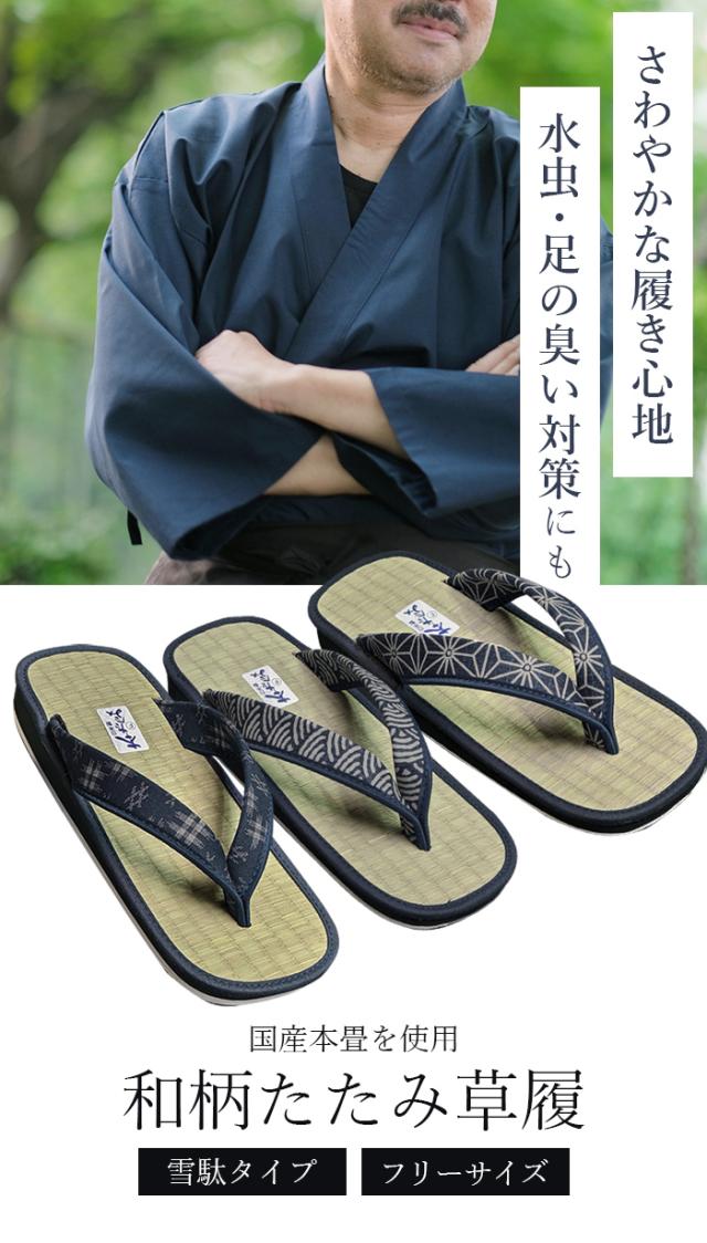 | 特徴 | 【職人の手作業/純国産品】 1足1足職人さんが最後まで手作業で丁寧に作り上げております。 職人の手作業で作った本畳を使用した和柄草履、紳士用雪駄タイプ。 ほんのり香るい草の香りが落ち着きます。 【国産本たたみを使用】 足を乗せる台の部分は国産本たたみを使用しております。 その為、通気性に優れており、夏の暑い時期でも蒸れにくいようになっております。 鼻緒タイプなので水虫対策・足の匂い対策にも! 【疲れにくく、歩きやすいEVAを使用】 底材にはフローリングに優しいEVAを使用しており、 外履きはもちろん部屋履きとして毎日お使い頂けます。 |
