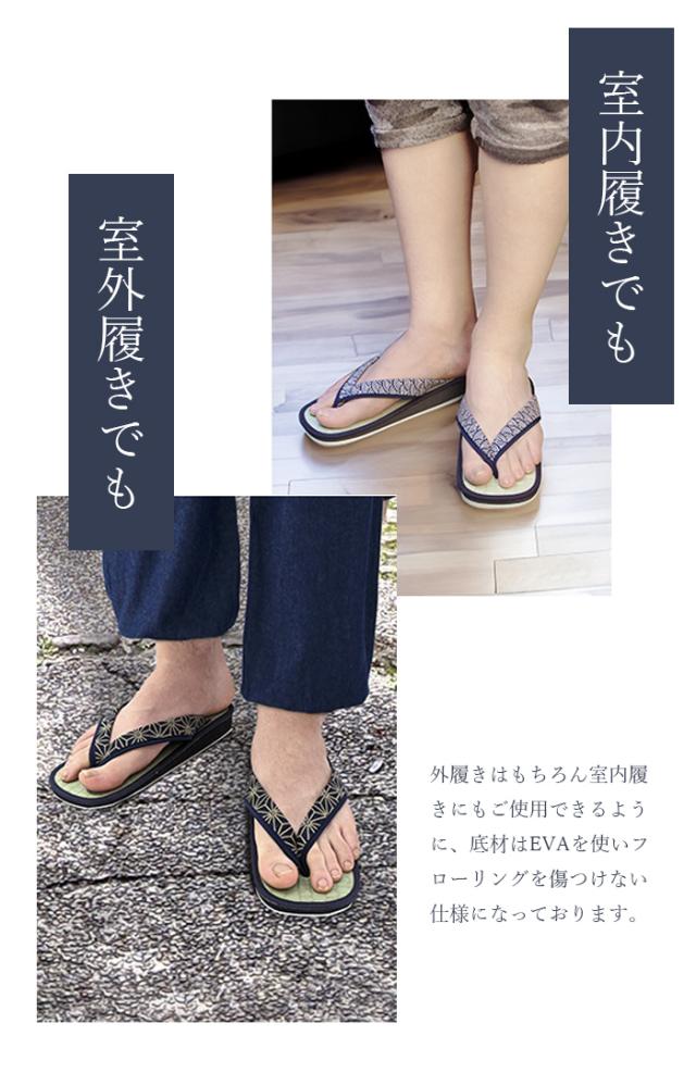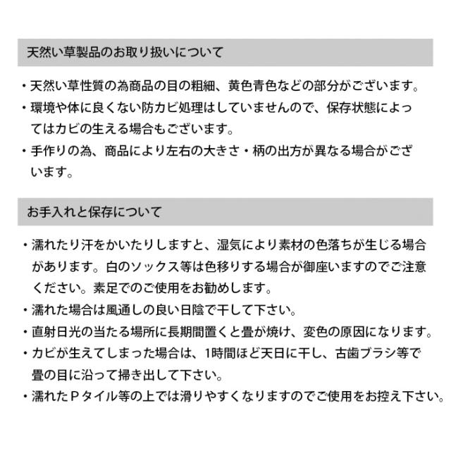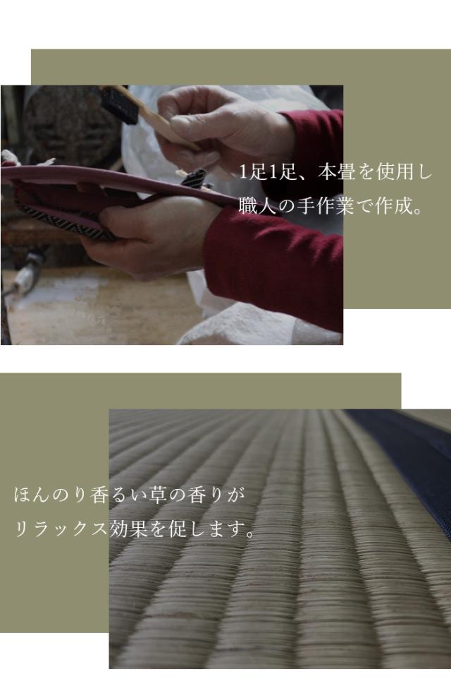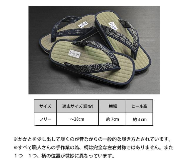 | 材質 | 鼻緒:綿・ナイロン 天板:国産い草・プレスボード 底材:EVA |
