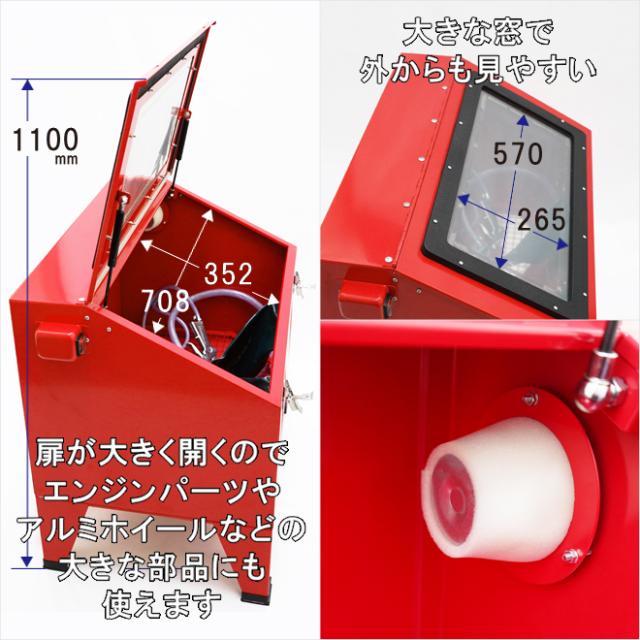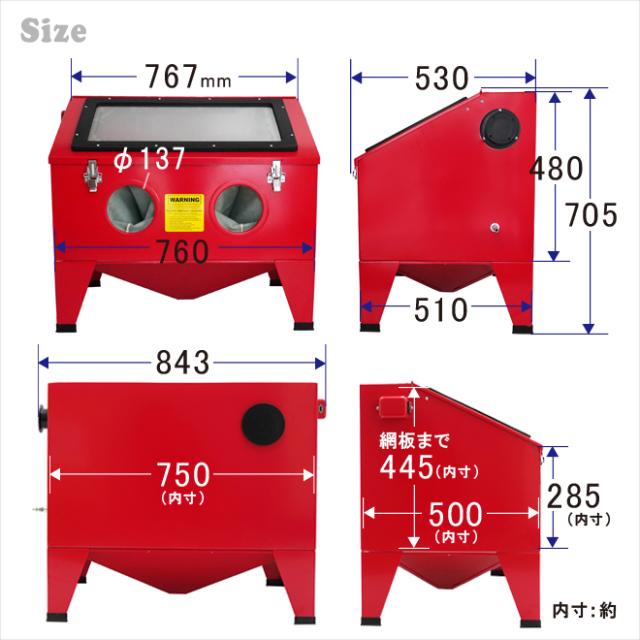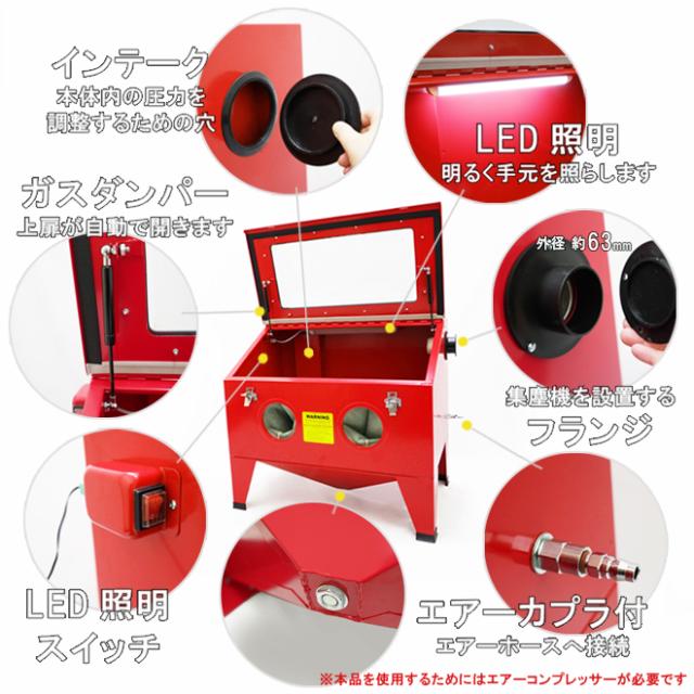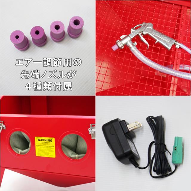 | 付属品 | ・ブラストガン ・先端ノズル 4種類(4・5・6・7mm) ・ゴム手袋 ・LED照明 ・LED用ACアダプター ・保護シート 5枚 ・シールテープ ・網棚用クッションテープ ・エアーカプラ |