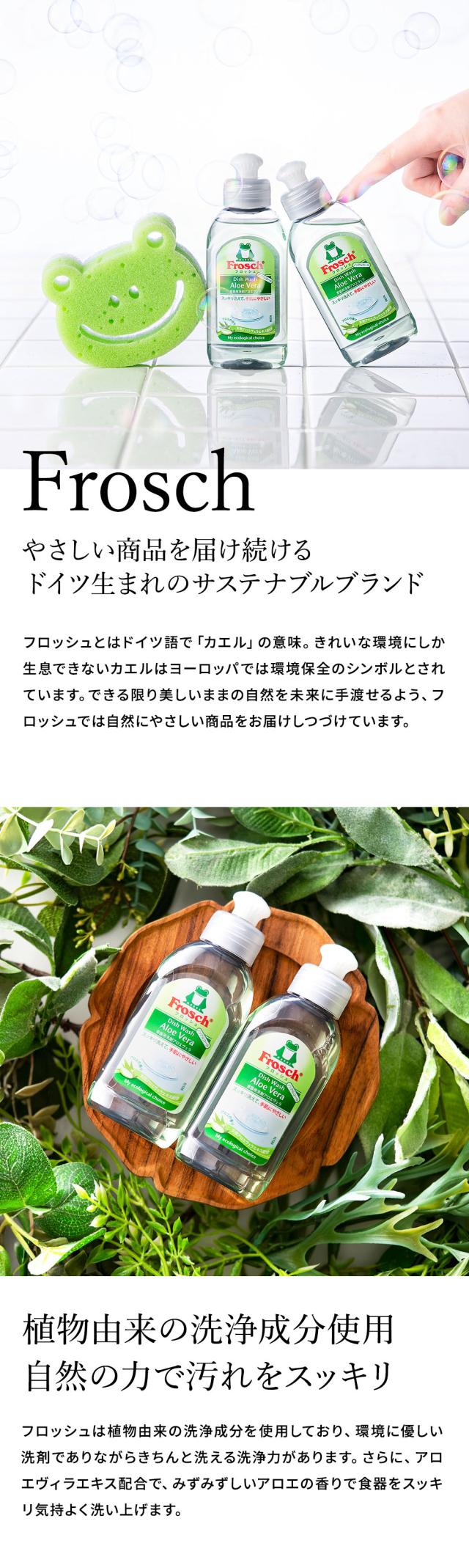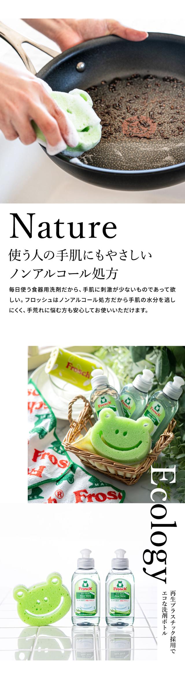 環境先進国ドイツ生まれのフロッシュは、 人にも、自然にも、気持ちいい 食器用洗剤。植物由来にこだわってヤシ油由来の洗浄成分を使用。アロエベラエキス配合ですっきり洗える。