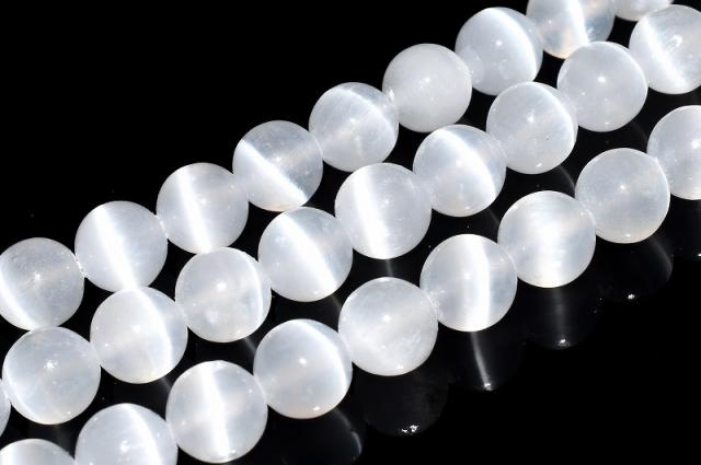 | 特徴・意味 | 優しい乳白色のカラーに美しいキャッツアイが輝く素敵な連ビーズです。 ジプサム【石膏】は世界中でも最も多く産出される鉱物の一つで、年間1億トンも産出されます。 その中でも無色透明なものをセレナイトと呼びます。 メキシコのナイカ山地下において世界最大の結晶の洞窟が発見され、それがジプサムだったのは記憶に新しいところです。加工品として最も一般的に流通しているジプサムはシルキーな光沢の繊維質を持ったホワイトカラーのものが一般的であり、一般的にはそのタイプのものをセレナイトと呼んでいますが、これは正確にはサテンスパーとなります。 その他にもデザートローズ(砂漠の薔薇)などもジプサムの仲間です。 大きく美しい結晶はかつて「聖母マリアのガラス」と呼ばれ、窓ガラスなどに利用されることもありました。 セレナイト(サテンスパーを含む)は非常に柔らかい石で、水や湿気、人の油脂が苦手な為、装飾品には向かない石なのですが、その美し さと清らかなエネルギーから愛好家の多い石でもあります。 |